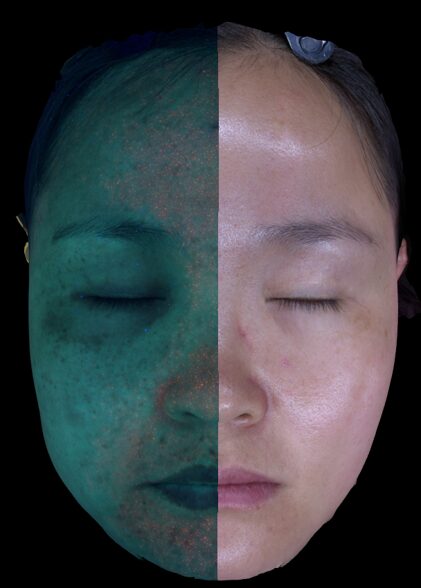 右側の画像は、特殊な光を当てることで、肉眼では見えにくい潜在的なシミや色素沈着(ポルフィリン)を浮き彫りにしたものです。