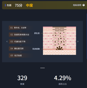 スコアが「75点 中度」、数量が「329」、面積占比(割合)が「4.29%」という具体的な数値も示されるため、診断結果が客観的で、ケア後の改善度合いも明確に確認できます。