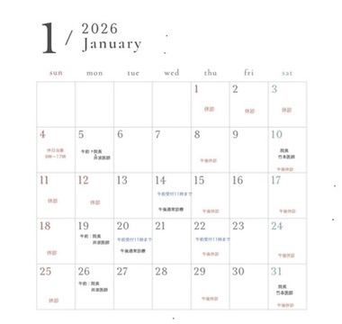 また、1月14日 20日 22日は、午前中の診療の受付が、午前11時で終了します。お間違えのないようにご来院ください。午後の診療時間に変更はありません。